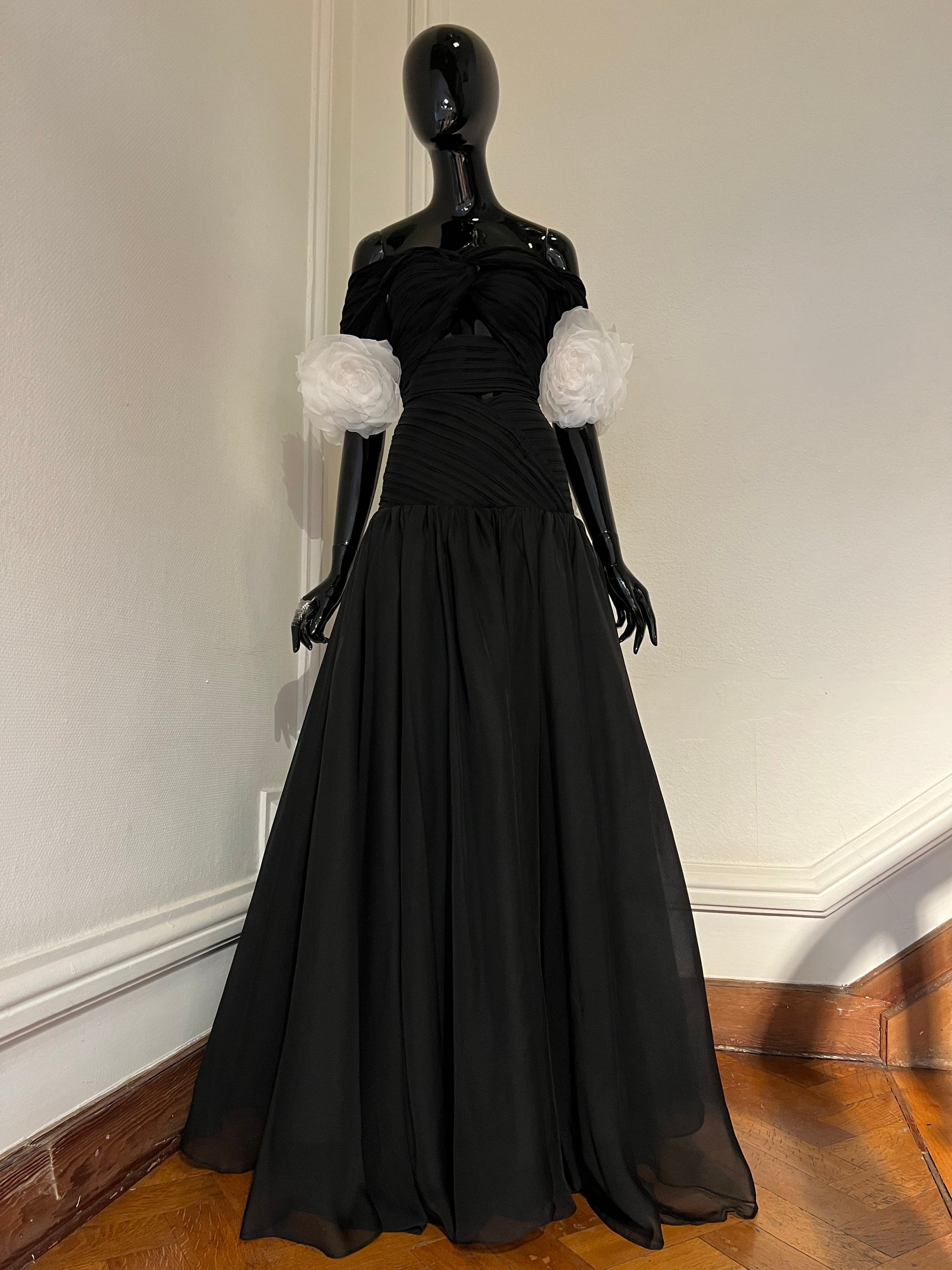 Evening dress top and skirt black chiffon pleated